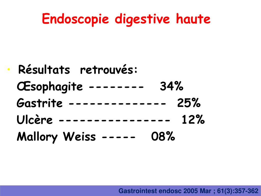 Endoscopie digestive haute • Résultats retrouvés: Œsophagite -------- 34% Gastrite -------------- 25% Ulcère ---------------- 12% Mallory Weiss ----- 08% Gastrointestendosc 2005 Mar ; 61(3):357-362