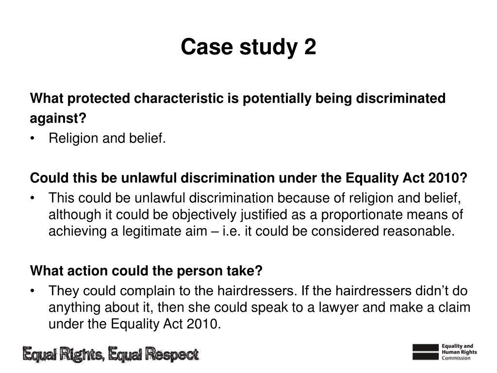 Case study 2 What protected characteristic is potentially being discriminated against? • Religion and belief. Could this be unlawful discrimination under the Equality Act 2010? • This could be unlawful discrimination because of religion and belief, although it could be objectively justified as a proportionate means of achieving a legitimate aim – i.e. it could be considered reasonable. What action could the person take? • They could complain to the hairdressers. If the hairdressers didn’t do anything about it, then she could speak to a lawyer and make a claim under the Equality Act 2010.