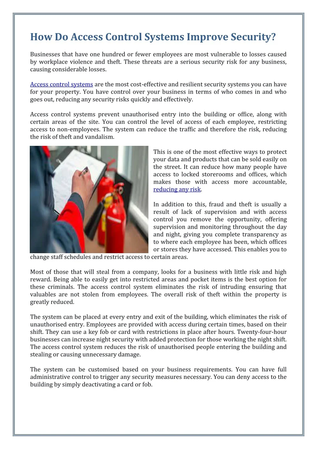 How Do Access Control Systems Improve Security? Businesses that have one hundred or fewer employees are most vulnerable to losses caused by workplace violence and theft. These threats are a serious security risk for any business, causing considerable losses. Access control systems are the most cost-effective and resilient security systems you can have for your property. You have control over your business in terms of who comes in and who goes out, reducing any security risks quickly and effectively. Access control systems prevent unauthorised entry into the building or office, along with certain areas of the site. You can control the level of access of each employee, restricting access to non-employees. The system can reduce the traffic and therefore the risk, reducing the risk of theft and vandalism. This is one of the most effective ways to protect your data and products that can be sold easily on the street. It can reduce how many people have access to locked storerooms and offices, which makes those with access more accountable, reducing any risk. In addition to this, fraud and theft is usually a result of lack of supervision and with access control you remove the opportunity, offering supervision and monitoring throughout the day and night, giving you complete transparency as to where each employee has been, which offices or stores they have accessed. This enables you to change staff schedules and restrict access to certain areas. Most of those that will steal from a company, looks for a business with little risk and high reward. Being able to easily get into restricted areas and pocket items is the best option for these criminals. The access control system eliminates the risk of intruding ensuring that valuables are not stolen from employees. The overall risk of theft within the property is greatly reduced. The system can be placed at every entry and exit of the building, which eliminates the risk of unauthorised entry. Employees are provided with access during certain times, based on their shift. They can use a key fob or card with restrictions in place after hours. Twenty-four-hour businesses can increase night security with added protection for those working the night shift. The access control system reduces the risk of unauthorised people entering the building and stealing or causing unnecessary damage. The system can be customised based on your business requirements. You can have full administrative control to trigger any security measures necessary. You can deny access to the building by simply deactivating a card or fob.