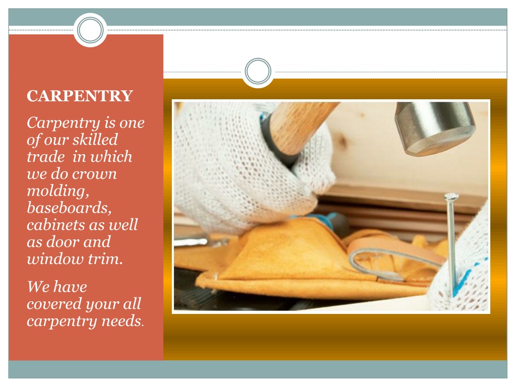 CARPENTRY Carpentry is one of our skilled trade in which we do crown molding, baseboards, cabinets as well as door and window trim. We have covered your all carpentry needs.