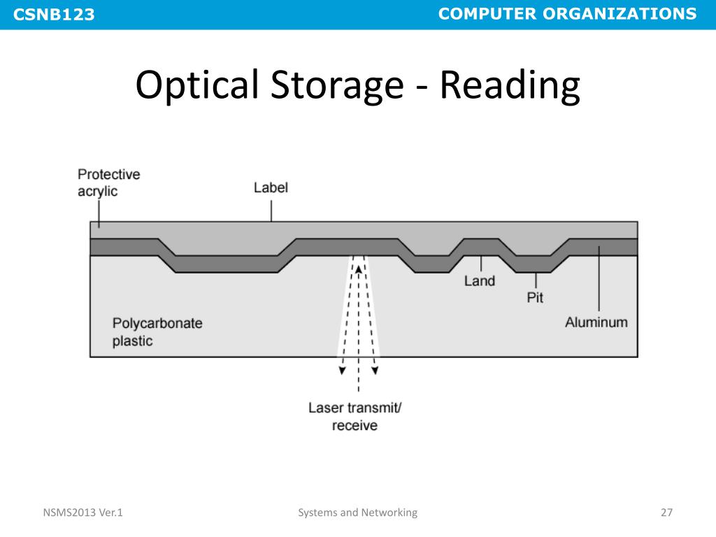 Optical Storage • Originally for audio • 650Mbytes giving over 70 minutes audio • The disk is formed from a resin such as polycarbonate. • Record data digitally (music/computer data) • Data recorded as a series of microscopic pits on the surface of the polycarbonate Systems and Networking