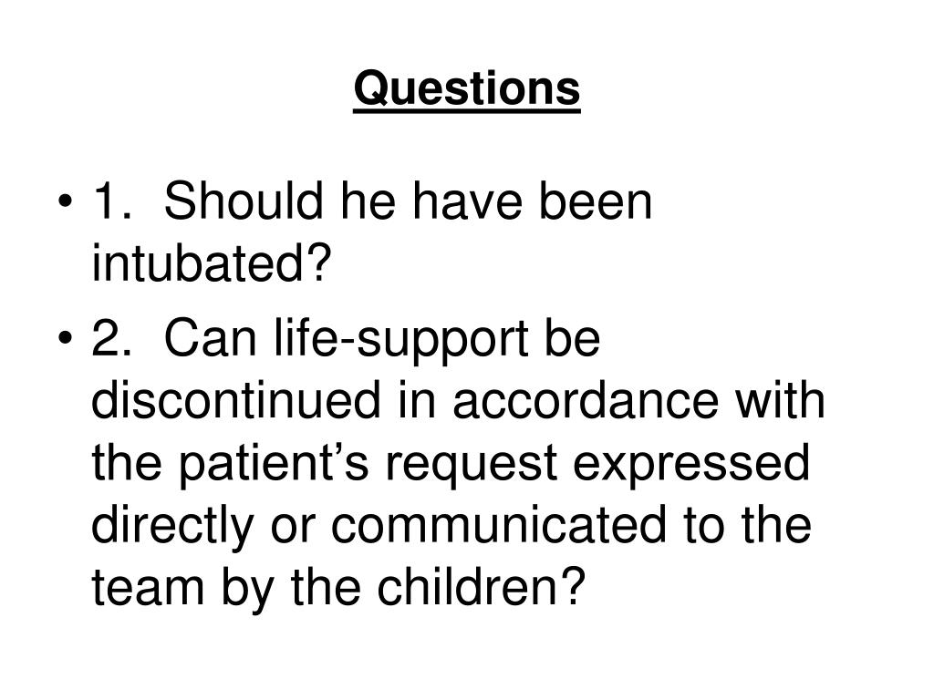 Questions • 1. Should he have been intubated? • 2. Can life-support be discontinued in accordance with the patient’s request expressed directly or communicated to the team by the children?