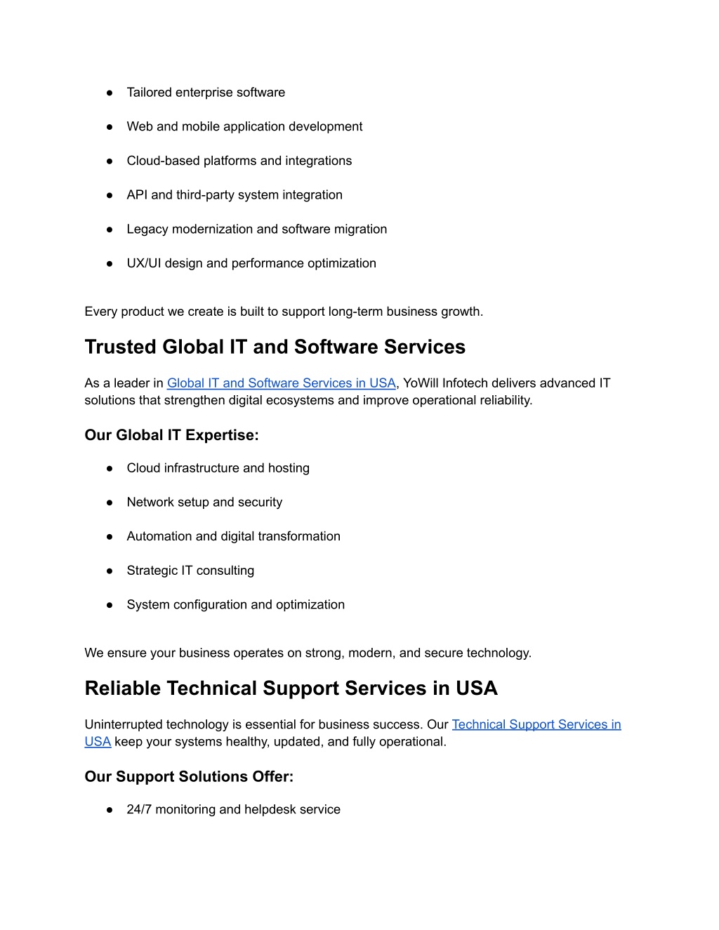 2. ● Tailored enterprise software ● Web and mobile application development ● Cloud-based platforms and integrations ● API and third-party system integration ● Legacy modernization and software migration ● UX/UI design and performance optimization Every product we create is built to support long-term business growth. Trusted Global IT and Software Services As a leader in Global IT and Software Services in USA, YoWill Infotech delivers advanced IT solutions that strengthen digital ecosystems and improve operational reliability. Our Global IT Expertise: ● Cloud infrastructure and hosting ● Network setup and security ● Automation and digital transformation ● Strategic IT consulting ● System configuration and optimization We ensure your business operates on strong, modern, and secure technology. Reliable Technical Support Services in USA Uninterrupted technology is essential for business success. Our Technical Support Services in USA keep your systems healthy, updated, and fully operational. Our Support Solutions Offer: ● 24/7 monitoring and helpdesk service