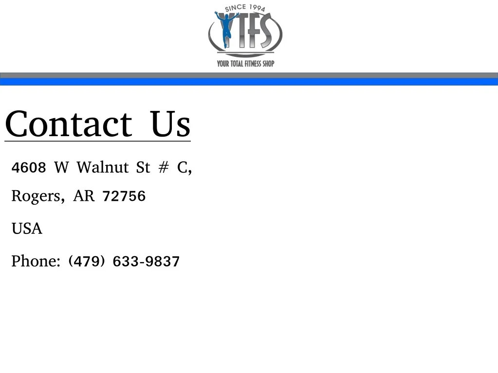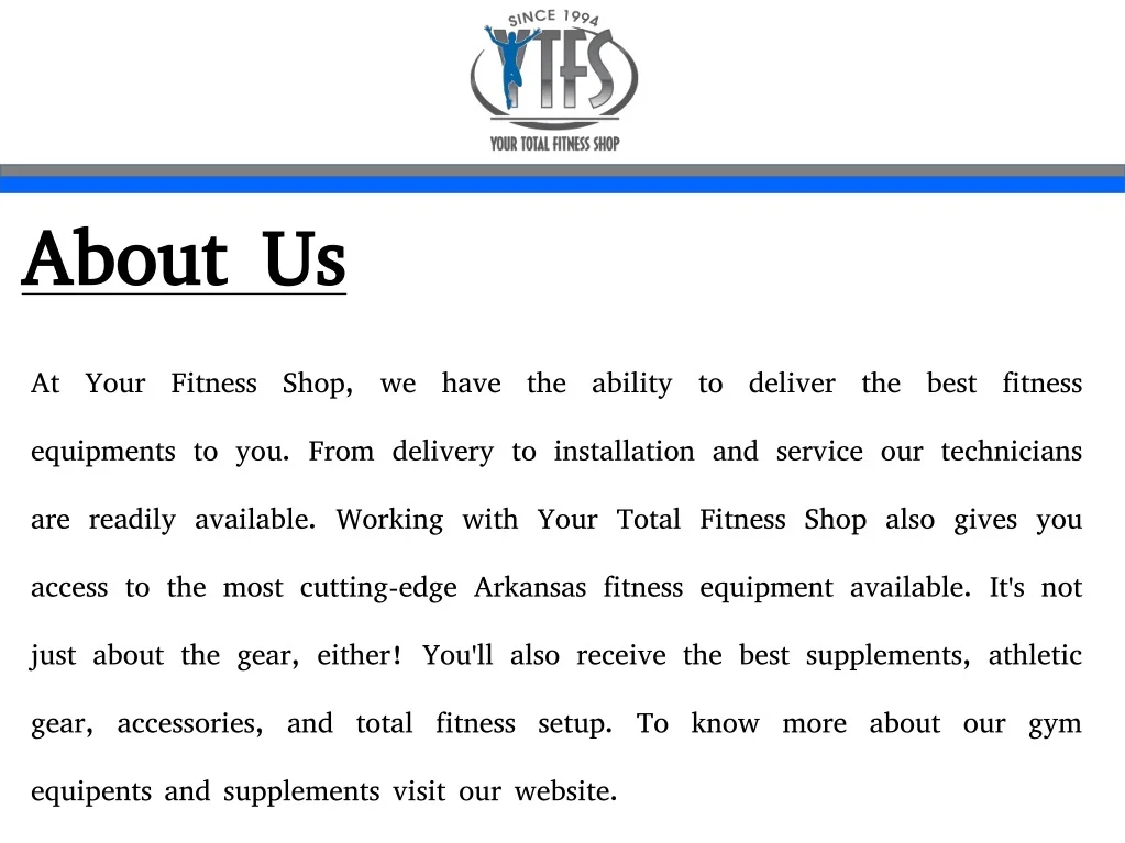 About Us At Your Fitness Shop, we have the ability to deliver the best fitness equipments to you. From delivery to installation and service our technicians are readily available. Working with Your Total Fitness Shop also gives you access to the most cutting-edge Arkansas fitness equipment available. It's not just about the gear, either! You'll also receive the best supplements, athletic gear, accessories, and total fitness setup. To know more about our gym equipents and supplements visit our website.