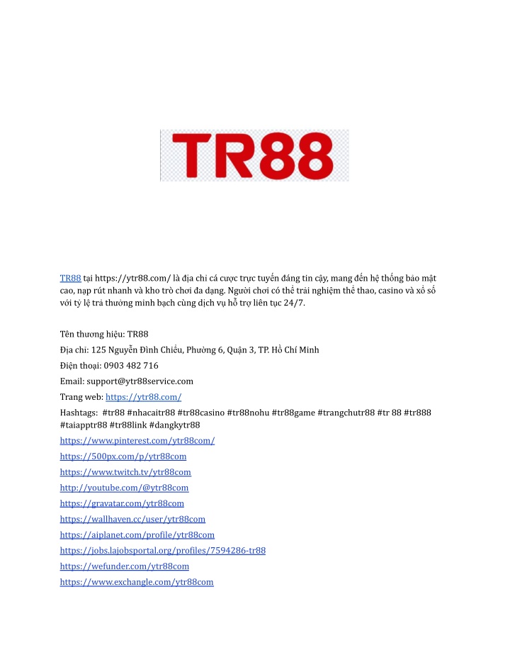TR88 tại https://ytr88.com/ là địa chỉ cá cược trực tuyến đáng tin cậy, mang đến hệ thống bảo mật cao, nạp rút nhanh và kho trò chơi đa dạng. Người chơi có thể trải nghiệm thể thao, casino và xổ số với tỷ lệ trả thưởng minh bạch cùng dịch vụ hỗ trợ liên tục 24/7. Tên thương hiệu: TR88 Địa chỉ: 125 Nguyễn Đình Chiểu, Phường 6, Quận 3, TP. Hồ Chí Minh Điện thoại: 0903 482 716 Email: support@ytr88service.com Trang web: https://ytr88.com/ Hashtags: #tr88 #nhacaitr88 #tr88casino #tr88nohu #tr88game #trangchutr88 #tr 88 #tr888 #taiapptr88 #tr88link #dangkytr88 https://www.pinterest.com/ytr88com/ https://500px.com/p/ytr88com https://www.twitch.tv/ytr88com http://youtube.com/@ytr88com https://gravatar.com/ytr88com https://wallhaven.cc/user/ytr88com https://aiplanet.com/profile/ytr88com https://jobs.lajobsportal.org/profiles/7594286-tr88 https://wefunder.com/ytr88com https://www.exchangle.com/ytr88com