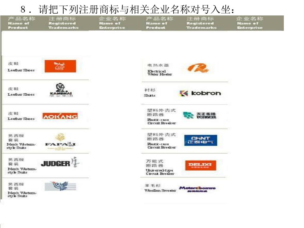 8.请把下列注册商标与相关企业名称对号入坐:8.请把下列注册商标与相关企业名称对号入坐: