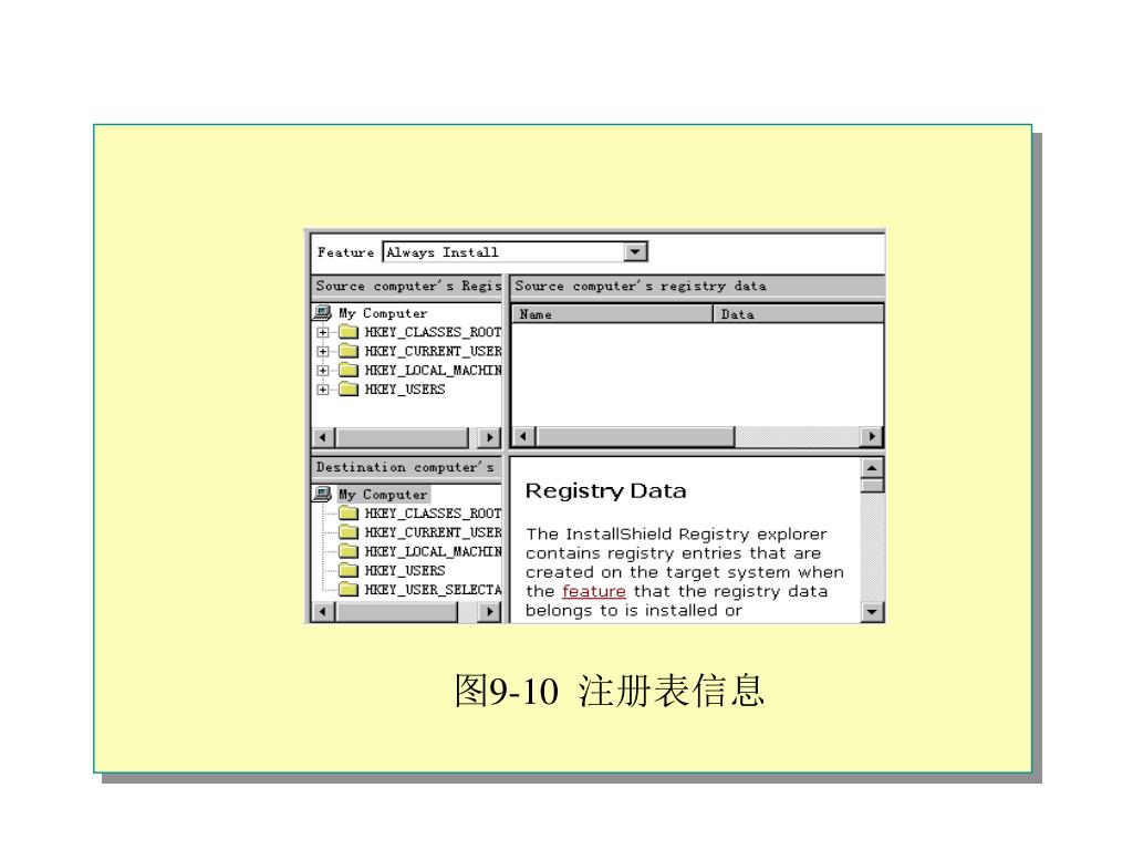 9.2.5 设置目标系统 • (1)Shortcuts/folders:该选项为安装程序定制快捷方式并且指定文件夹,同时指定了快捷方式的存放位置。并提供了几个具有Windows标准的快捷方式的存放位置,具体如图9-9所示。 • (2)Registry:该选项主要用来提供安装程序修改注册表的所需信息,如图9-10所示。 • (3)DBC Resources:该选项提供了ODBC数据源的设置向导。如图9-11所示。