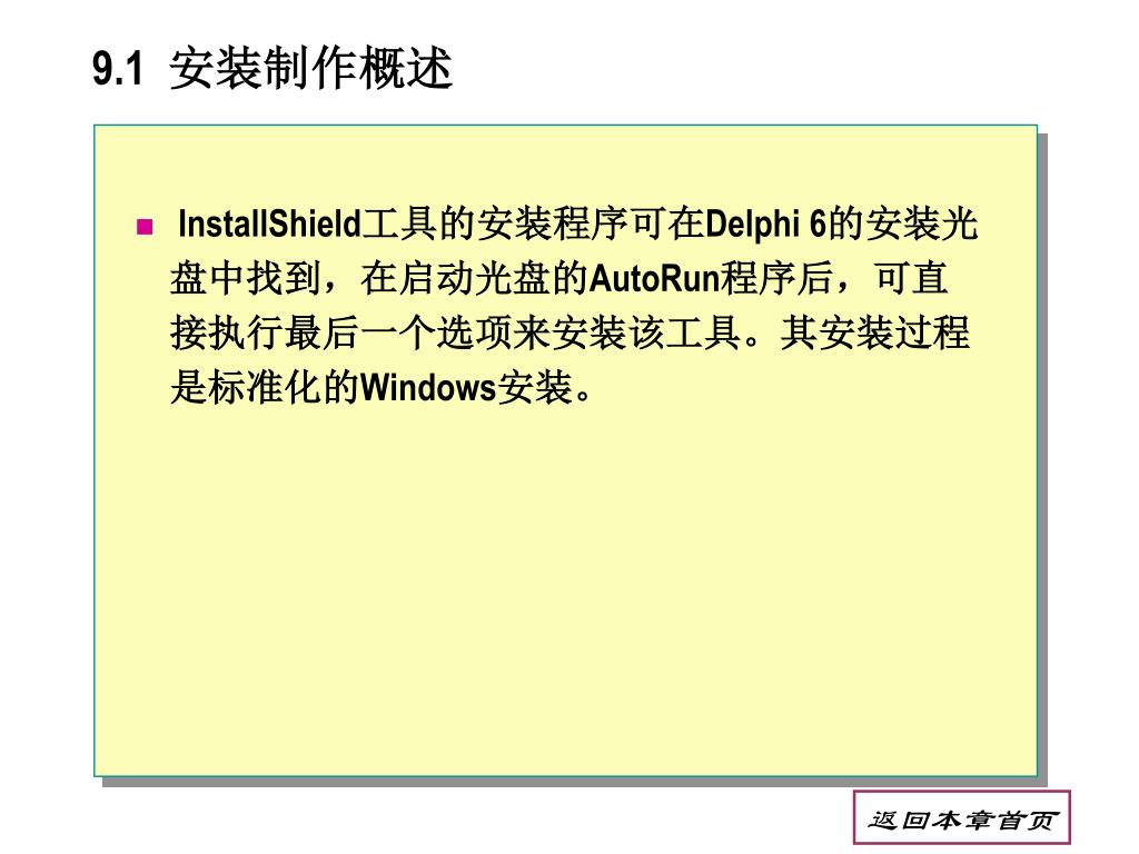 9.1 安装制作概述 • InstallShield工具的安装程序可在Delphi 6的安装光盘中找到,在启动光盘的AutoRun程序后,可直接执行最后一个选项来安装该工具。其安装过程是标准化的Windows安装。 返回本章首页