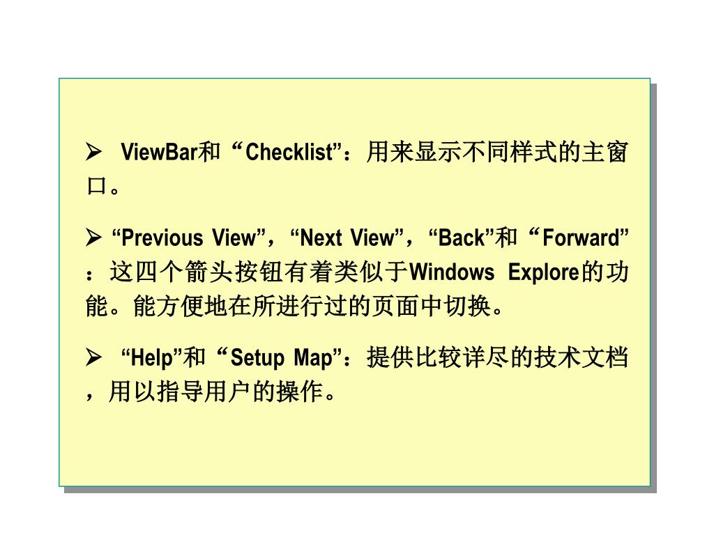 Ø ViewBar和“Checklist”:用来显示不同样式的主窗口。Ø ViewBar和“Checklist”:用来显示不同样式的主窗口。 Ø “Previous View”,“Next View”,“Back”和“Forward”:这四个箭头按钮有着类似于Windows Explore的功能。能方便地在所进行过的页面中切换。 Ø “Help”和“Setup Map”:提供比较详尽的技术文档,用以指导用户的操作。