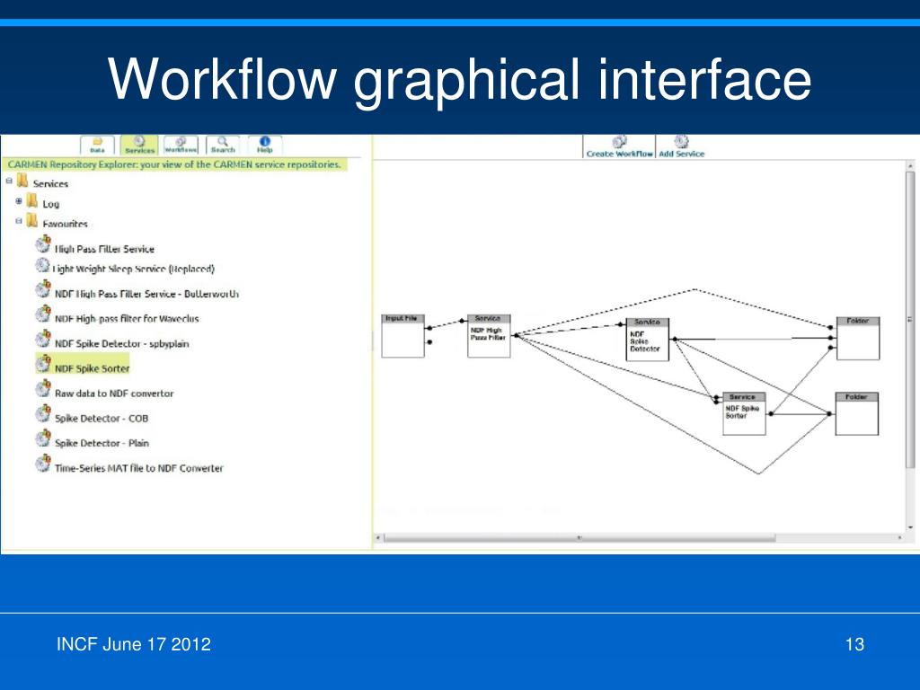CARMEN project status • Initially a 4 year UK e-Science project • From September 2006-March 2011 • Extended with BBSRC tools and techniques grant • To Sept 2014 • Major work in last 2 years has been • Improving User Interface • NDF implementation (working) • Workflow Implementation (nearly there!) INCF June 17 2012