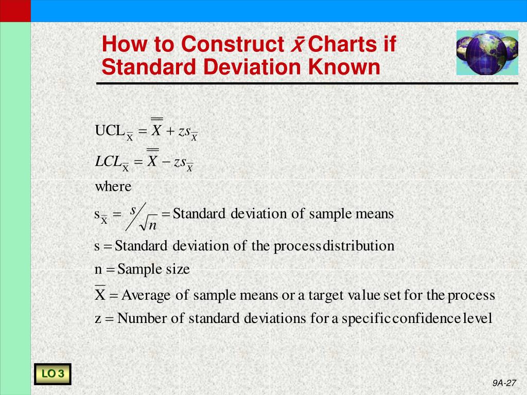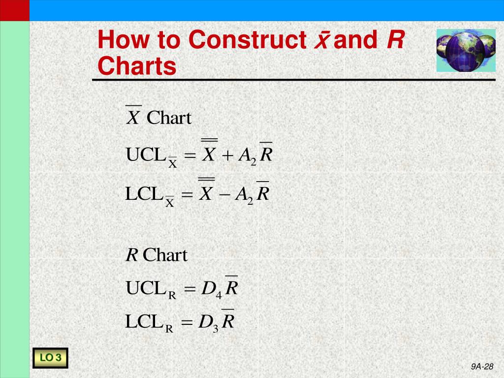 Process Control with Variable Measurements: Using x and R Charts • In variable sampling, we measure actual values rather than sampling attributes • Generally want small sample size • Quicker • Cheaper • Samples of 4-5 are typical • Want 25 or so samples to set up chart LO 3