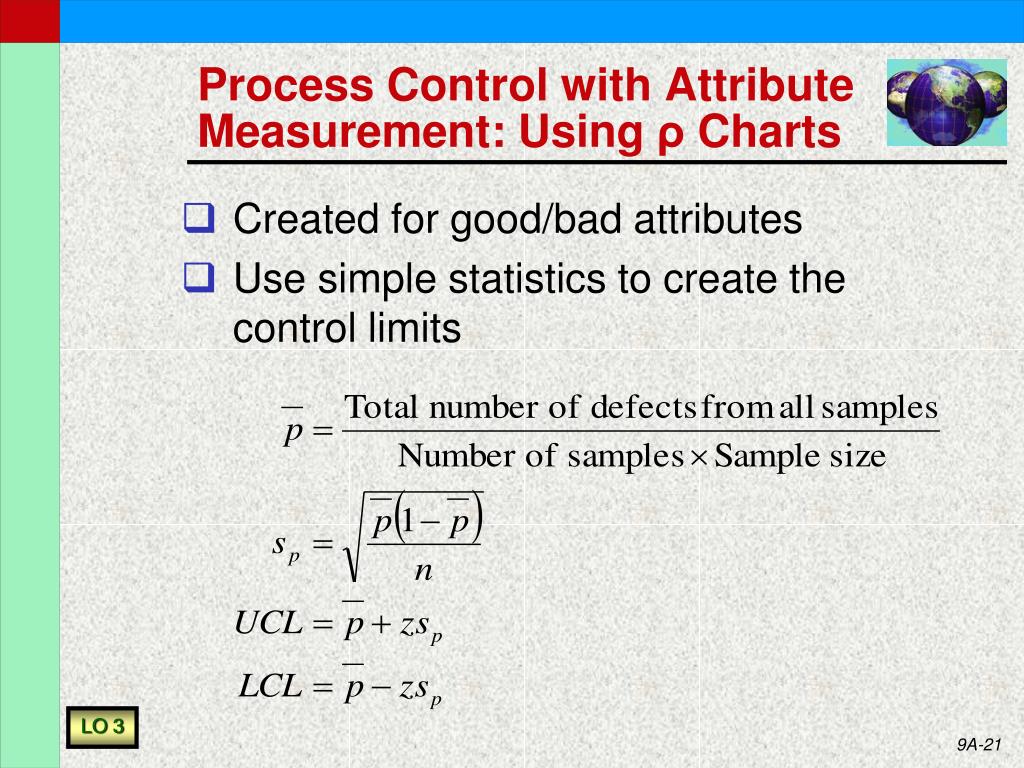 Process Control with Attribute Measurement: Using ρ Charts • Created for good/bad attributes • Use simple statistics to create the control limits LO 3