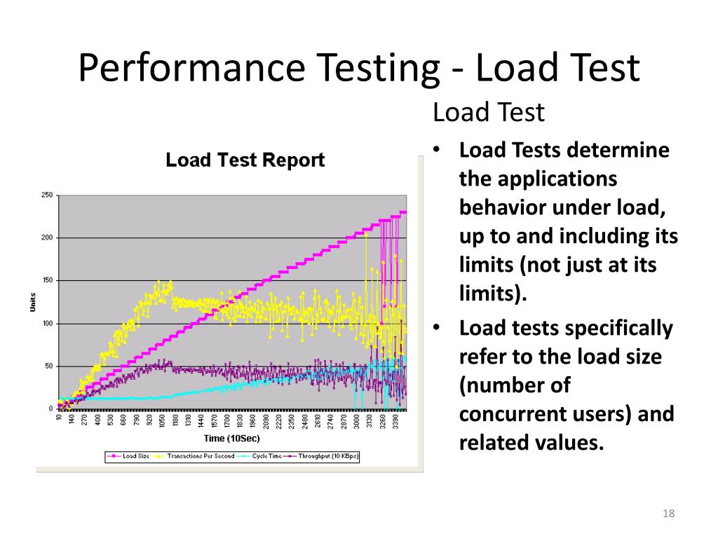 Load Test Load Tests determine the applications behavior under load, up to and including its limits (not just at its limits). Load tests specifically refer to the load size (number of concurrent users) and related values. Performance Testing - Load Test