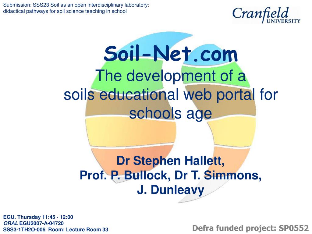 Submission: SSS23 Soil as an open interdisciplinary laboratory: didactical pathways for soil science teaching in school Soil-Net.comThe development of asoils educational web portal for schools age Dr Stephen Hallett,Prof. P. Bullock, Dr T. Simmons,J. Dunleavy EGU. Thursday 11:45 - 12:00ORAL EGU2007-A-04720 SSS3-1TH2O-006 Room: Lecture Room 33 Defra funded project: SP0552
