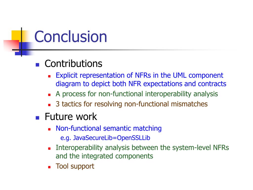 Conclusion • Contributions • Explicit representation of NFRs in the UML component diagram to depict both NFR expectations and contracts • A process for non-functional interoperability analysis • 3 tactics for resolving non-functional mismatches • Future work • Non-functional semantic matching e.g. JavaSecureLib=OpenSSLLib • Interoperability analysis between the system-level NFRs and the integrated components • Tool support