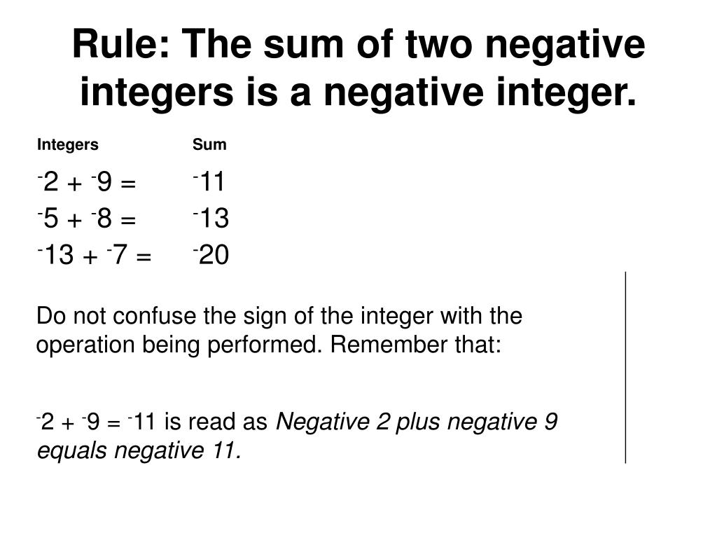 To add a positive and a negative integer (or a negative and a positive integer), follow these steps: