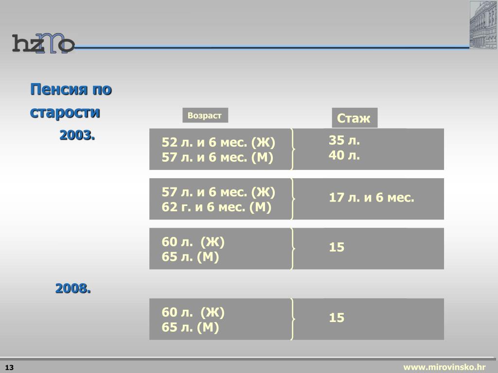 Возраст Стаж 2003. 52 л. и 6 мес. (Ж) 57 л. и 6 мес. (M) 35 л. 40 л. 57 л. и 6 мес. (Ж) 62 г. и 6 мес. (M) 17 л. и 6 мес. 60 л. (Ж) 65 л. (M) 15 2008. 60 л. (Ж) 65 л. (M) 15 Пенсия по старости 13