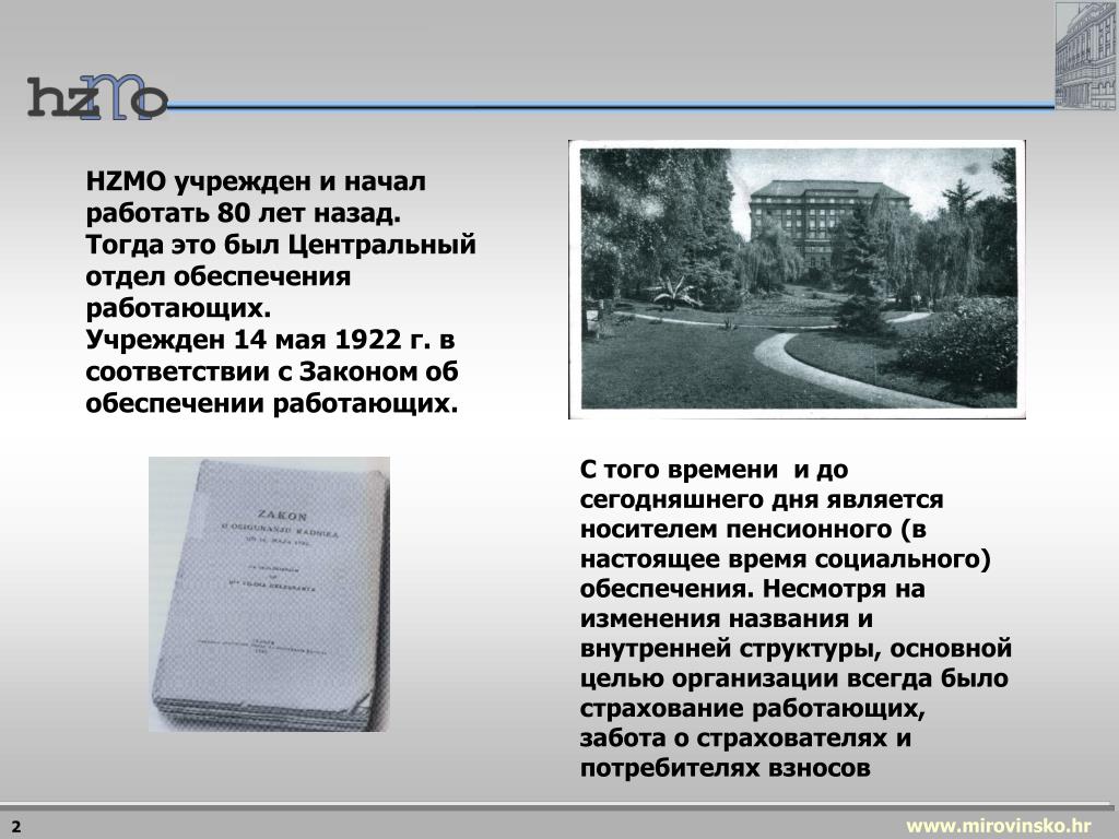 Пенсионное обеспечение. на базе солидарности возрастов. HZMO учрежден и начал работать 80 лет назад. Тогда это был Центральный отдел обеспечения работающих. Учрежден 14 мая 1922 г . в соответствии с Законом об обеспечении работающих.