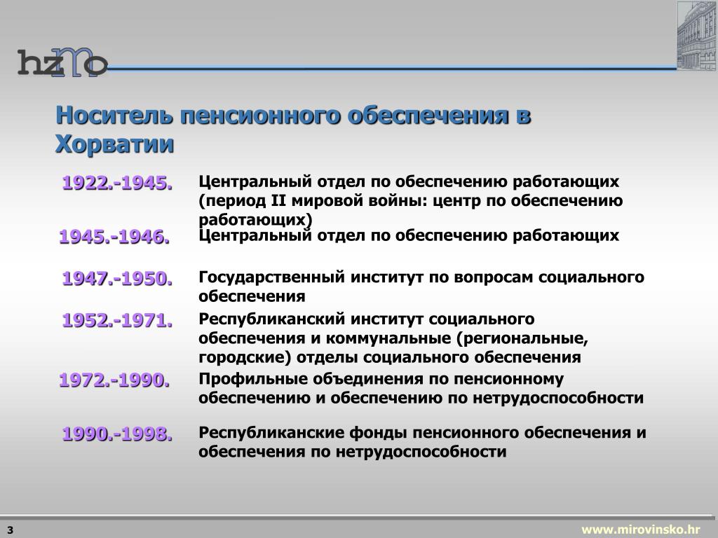 1922.-1945. Центральный отдел по обеспечению работающих (период II мировой войны: центр по обеспечению работающих) 1945.-1946. Центральный отдел по обеспечению работающих 1947.-1950. Государственный институт по вопросам социального обеспечения 1952.-1971. Республиканский институт социального обеспечения и коммунальные (региональные, городские) отделы социального обеспечения 1972.-1990. Профильные объединения по пенсионному обеспечению и обеспечению по нетрудоспособности 1990.-1998. Республиканские фонды пенсионного обеспечения и обеспечения по нетрудоспособности Носитель пенсионного обеспечения в Хорватии 3