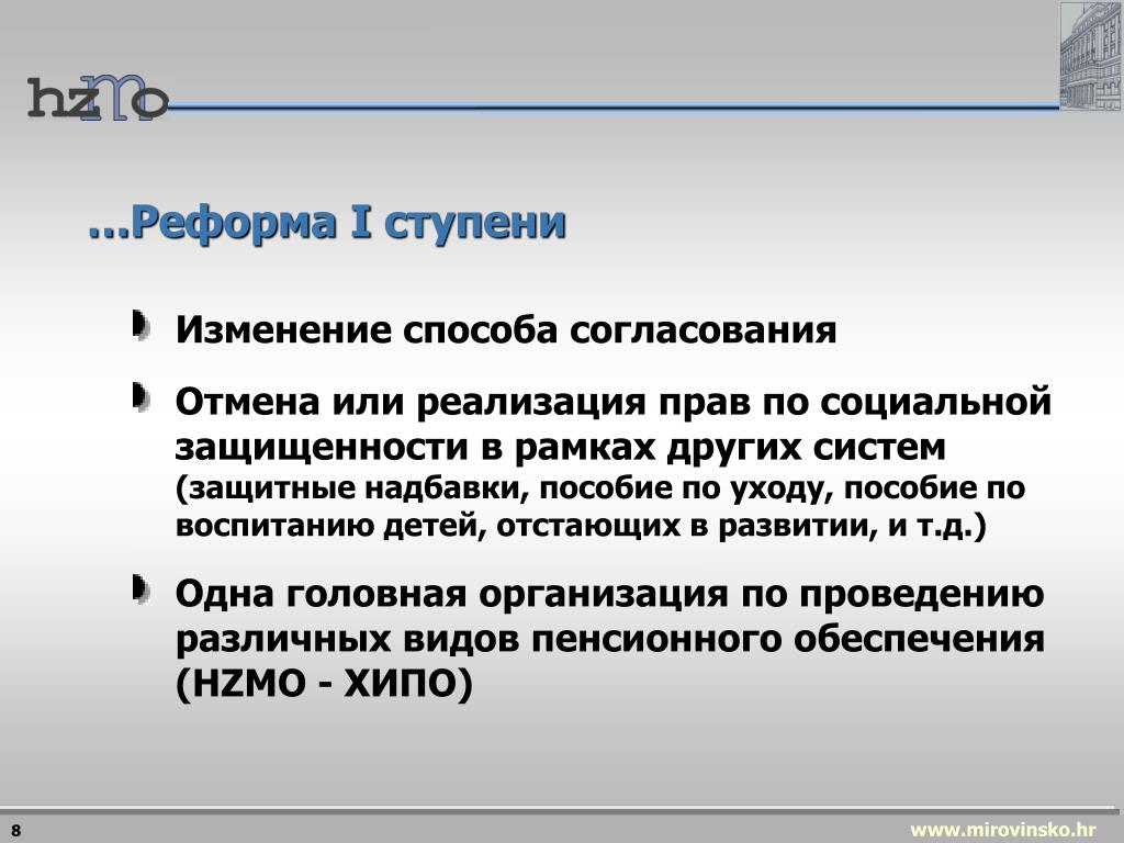 …Реформа I ступени • Изменение способа согласования • Отмена или реализация прав по социальной защищенности в рамках других систем (защитные надбавки, пособие по уходу, пособие по воспитанию детей, отстающих в развитии, и т.д.) • Одна головная организация по проведению различных видовпенсионного обеспечения (HZMO - ХИПО) 8