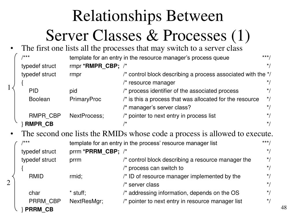 Relationships Between Server Classes & Processes (1) • The first one lists all the processes that may switch to a server class • /*** template for an entry in the resource manager’s process queue ***/ • typedef struct rmpr *RMPR_CBP; /* */ • typedef struct rmpr /* control block describing a process associated with the */ • { /* resource manager */ • PID pid /* process identifier of the associated process */ • Boolean PrimaryProc /* is this a process that was allocated for the resource */ • /* manager’s server class? */ • RMPR_CBP NextProcess; /* pointer to next entry in process list */ • } RMPR_CB /* */ • The second one lists the RMIDs whose code a process is allowed to execute. • /*** template for an entry in the process’ resource manager list ***/ • typedef struct prrm *PRRM_CBP; /* */ • typedef struct prrm /* control block describing a resource manager the */ • { /* process can switch to */ • RMID rmid; /* ID of resource manager implemented by the */ • /* server class */ • char * stuff; /* addressing information, depends on the OS */ • PRRM_CBP NextResMgr; /* pointer to next entry in resource manager list */ • } PRRM_CB 1 2