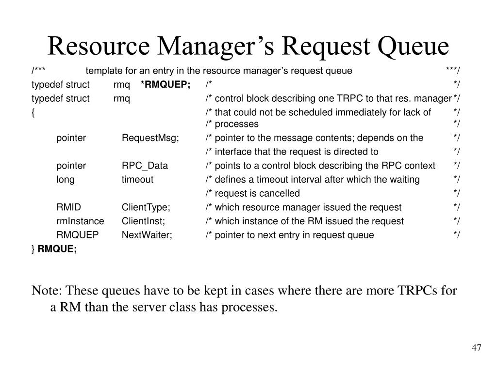 Resource Manager’s Request Queue /*** template for an entry in the resource manager’s request queue ***/ typedef struct rmq *RMQUEP; /* */ typedef struct rmq /* control block describing one TRPC to that res. manager */ { /* that could not be scheduled immediately for lack of */ /* processes */ pointer RequestMsg; /* pointer to the message contents; depends on the */ /* interface that the request is directed to */ pointer RPC_Data /* points to a control block describing the RPC context */ long timeout /* defines a timeout interval after which the waiting */ /* request is cancelled */ RMID ClientType; /* which resource manager issued the request */ rmInstance ClientInst; /* which instance of the RM issued the request */ RMQUEP NextWaiter; /* pointer to next entry in request queue */ } RMQUE; Note: These queues have to be kept in cases where there are more TRPCs for a RM than the server class has processes.