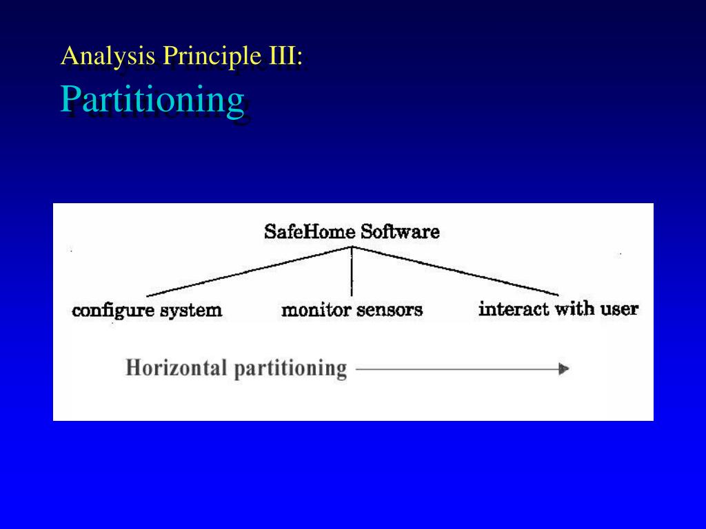 Analysis Principles • Operational principles • Represent and understand information domain • Define functions that must be performed • Represent behavior of software (to external events) • Partition information, function and behavior models hierarchically • Move from essential information to implementation detail