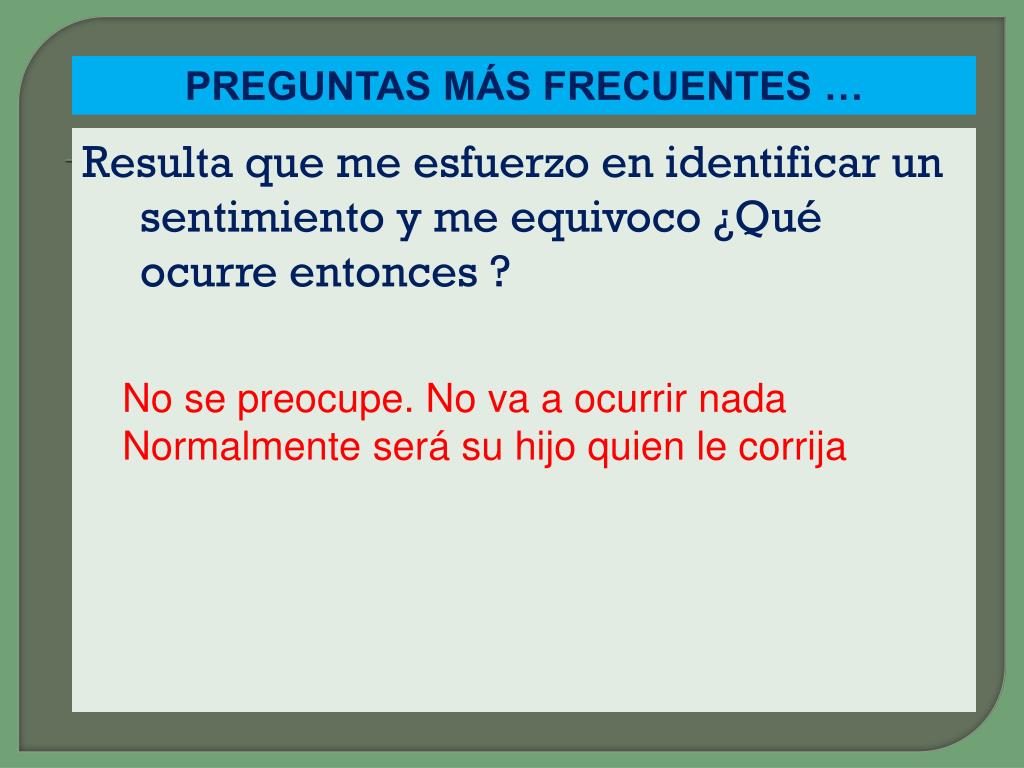 PREGUNTAS MÁS FRECUENTES … No se preocupe. No va a ocurrir nada Normalmente será su hijo quien le corrija Resulta que me esfuerzo en identificar un sentimiento y me equivoco ¿Qué ocurre entonces ?