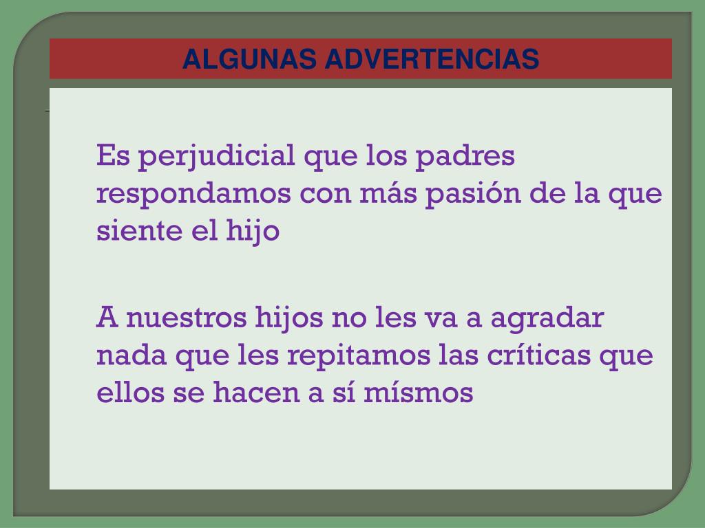 ALGUNAS ADVERTENCIAS Es perjudicial que los padres respondamos con más pasión de la que siente el hijo A nuestros hijos no les va a agradar nada que les repitamos las críticas que ellos se hacen a sí mísmos