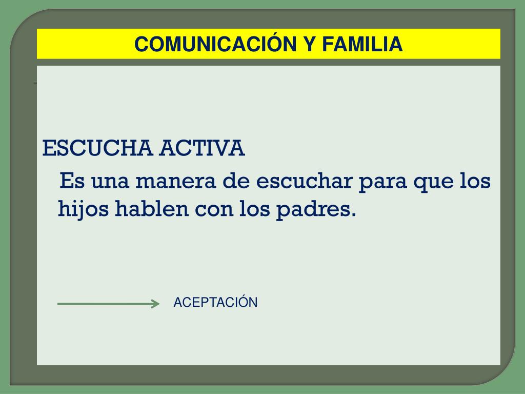COMUNICACIÓN Y FAMILIA ACEPTACIÓN ESCUCHA ACTIVA Es una manera de escuchar para que los hijos hablen con los padres.