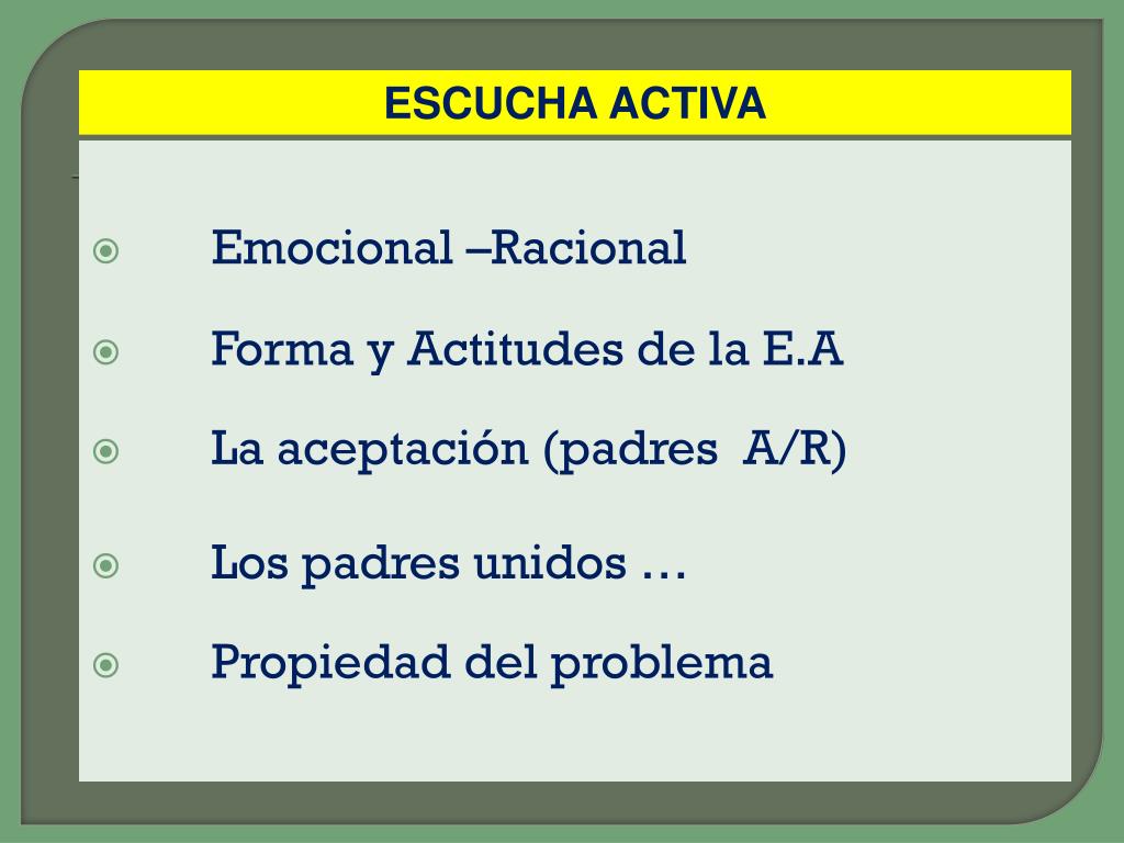 ESCUCHA ACTIVA • Emocional –Racional • Forma y Actitudes de la E.A • La aceptación (padres A/R) • Los padres unidos … • Propiedad del problema