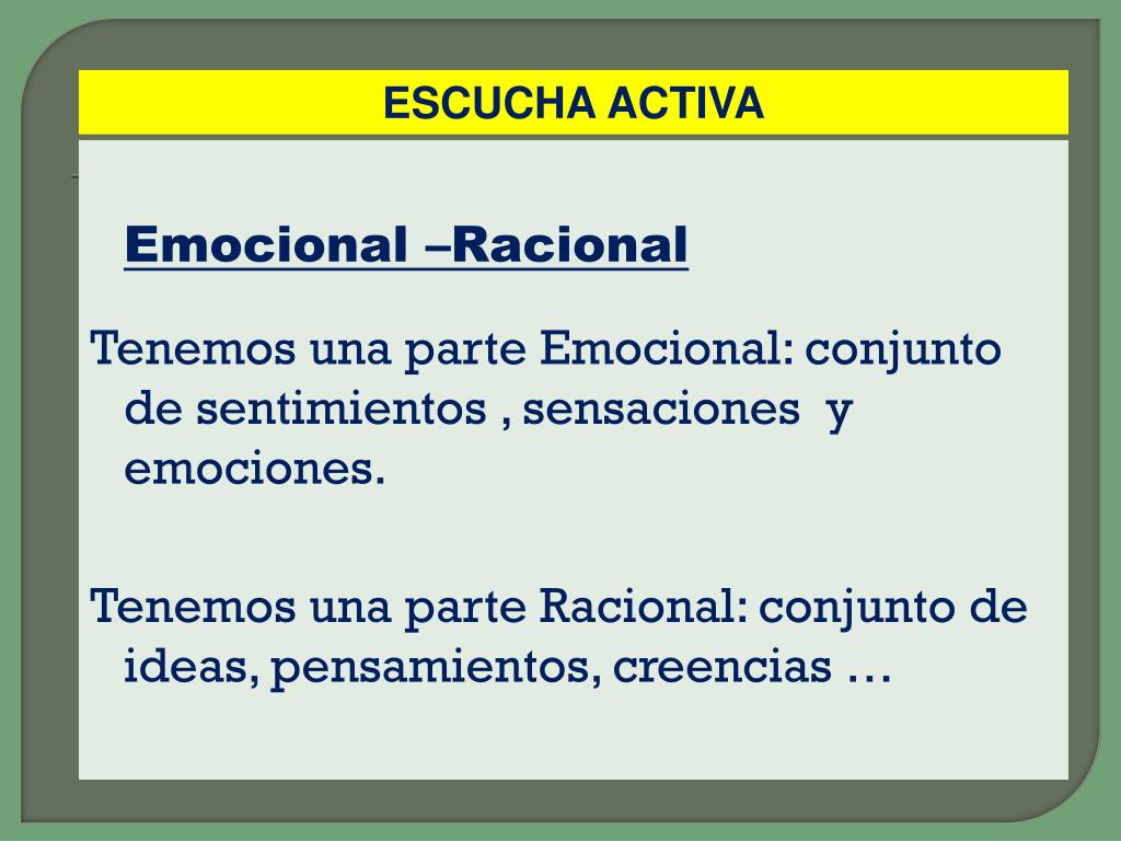 ESCUCHA ACTIVA Emocional –Racional Tenemos una parte Emocional: conjunto de sentimientos , sensaciones y emociones. Tenemos una parte Racional: conjunto de ideas, pensamientos, creencias …