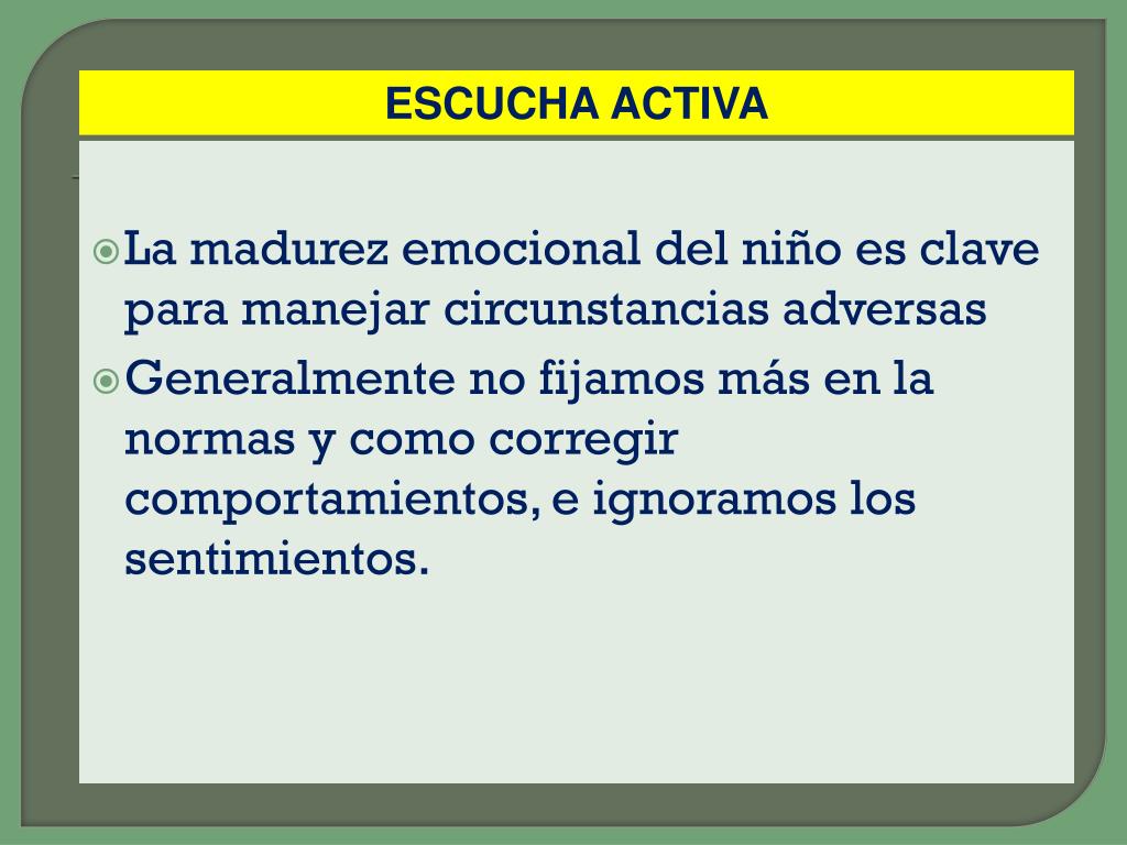 ESCUCHA ACTIVA • La madurez emocional del niño es clave para manejar circunstancias adversas • Generalmente no fijamos más en la normas y como corregir comportamientos, e ignoramos los sentimientos.