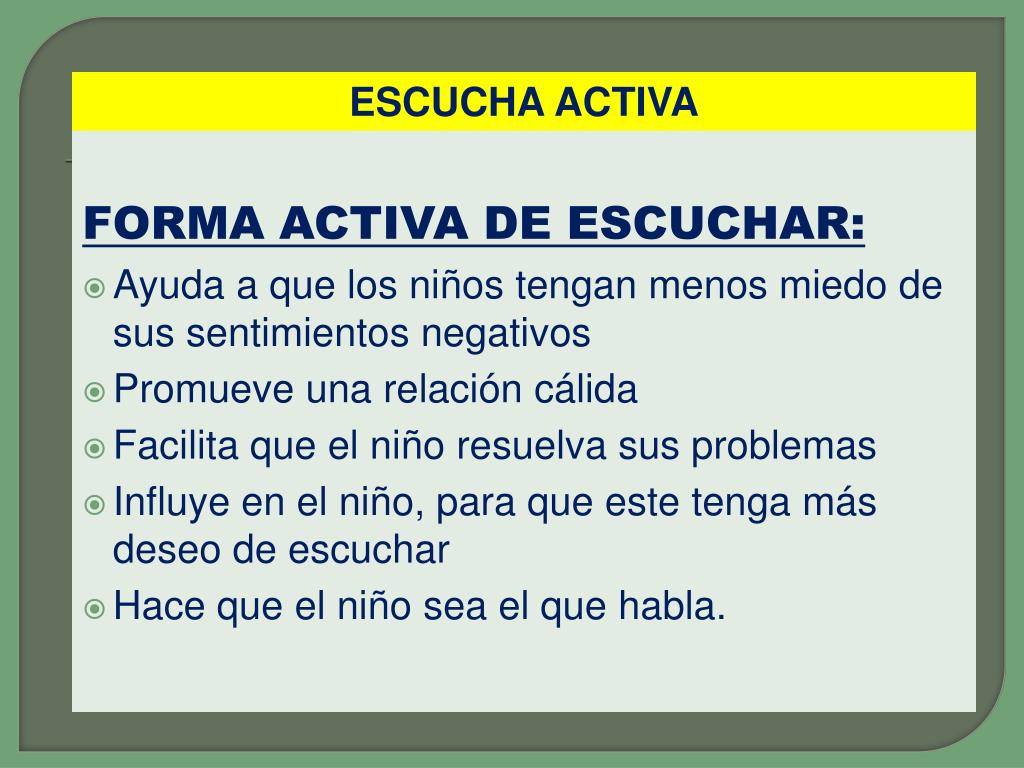 ESCUCHA ACTIVA FORMA ACTIVA DE ESCUCHAR: • Ayuda a que los niños tengan menos miedo de sus sentimientos negativos • Promueve una relación cálida • Facilita que el niño resuelva sus problemas • Influye en el niño, para que este tenga más deseo de escuchar • Hace que el niño sea el que habla.