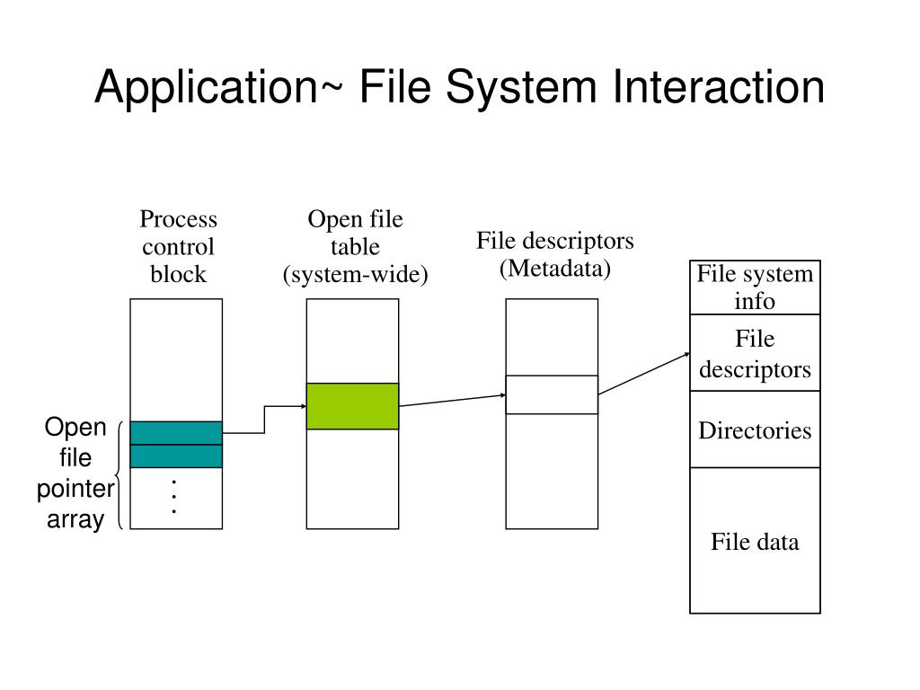 Application~ File System Interaction Process control block Open file table (system-wide) File descriptors (Metadata) File system info File descriptors Directories Open file pointer array . . . File data