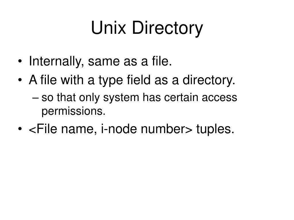 Unix Directory • Internally, same as a file. • A file with a type field as a directory. • so that only system has certain access permissions. • <File name, i-node number> tuples.