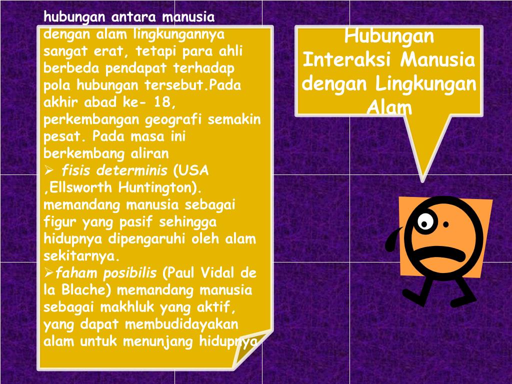 hubungan antara manusia dengan alam lingkungannya sangat erat, tetapi para ahli berbeda pendapat terhadap pola hubungan tersebut.Pada akhir abad ke- 18, perkembangan geografi semakin pesat. Pada masa ini berkembang aliran • fisis determinis (USA ,Ellsworth Huntington). memandang manusia sebagai figur yang pasif sehingga hidupnya dipengaruhi oleh alam sekitarnya. • faham posibilis (Paul Vidal de la Blache) memandang manusia sebagai makhluk yang aktif, yang dapat membudidayakan alam untuk menunjang hidupnya Hubungan Interaksi Manusia dengan Lingkungan Alam
