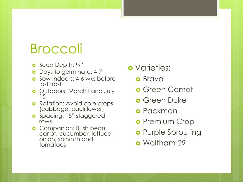 Broccoli • Seed Depth: ¼” • Days to germinate: 4-7 • Sow Indoors: 4-6 wks before last frost • Outdoors: March1 and July 15 • Rotation: Avoid cole crops (cabbage, cauliflower) • Spacing: 15” staggered rows • Companion: Bush bean, carrot, cucumber, lettuce, onion, spinach and tomatoes • Varieties: • Bravo • Green Comet • Green Duke • Packman • Premium Crop • Purple Sprouting • Waltham 29