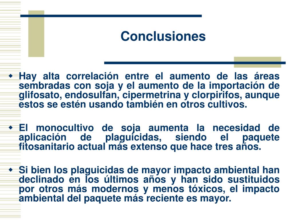 Conclusiones • Hay alta correlación entre el aumento de las áreas sembradas con soja y el aumento de la importación de glifosato, endosulfan, cipermetrina y clorpirifos, aunque estos se estén usando también en otros cultivos. • El monocultivo de soja aumenta la necesidad de aplicación de plaguicidas, siendo el paquete fitosanitario actual más extenso que hace tres años. • Si bien los plaguicidas de mayor impacto ambiental han declinado en los últimos años y han sido sustituidos por otros más modernos y menos tóxicos, el impacto ambiental del paquete más reciente es mayor.