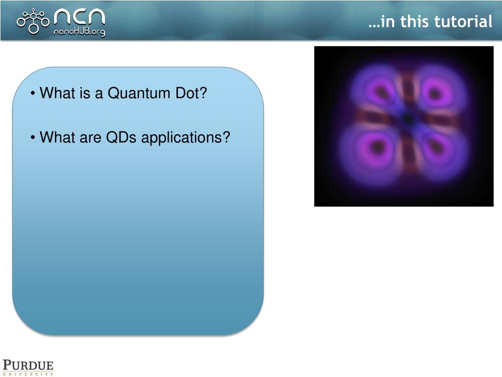 …in this tutorial • What is a Quantum Dot? • What are QDs applications? • Fabrication of Quantum Dots • Strain • Wavefunctions on a subdomain • Tutorials • What is a Quantum Dot? • What are QDs applications? • Fabrication of Quantum Dots