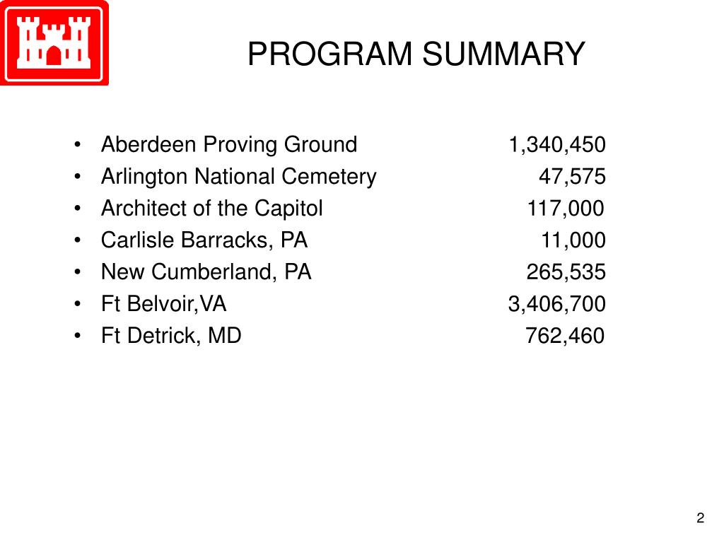PROGRAM SUMMARY • Aberdeen Proving Ground 1,340,450 • Arlington National Cemetery 47,575 • Architect of the Capitol 117,000 • Carlisle Barracks, PA 11,000 • New Cumberland, PA 265,535 • Ft Belvoir,VA 3,406,700 • Ft Detrick, MD 762,460