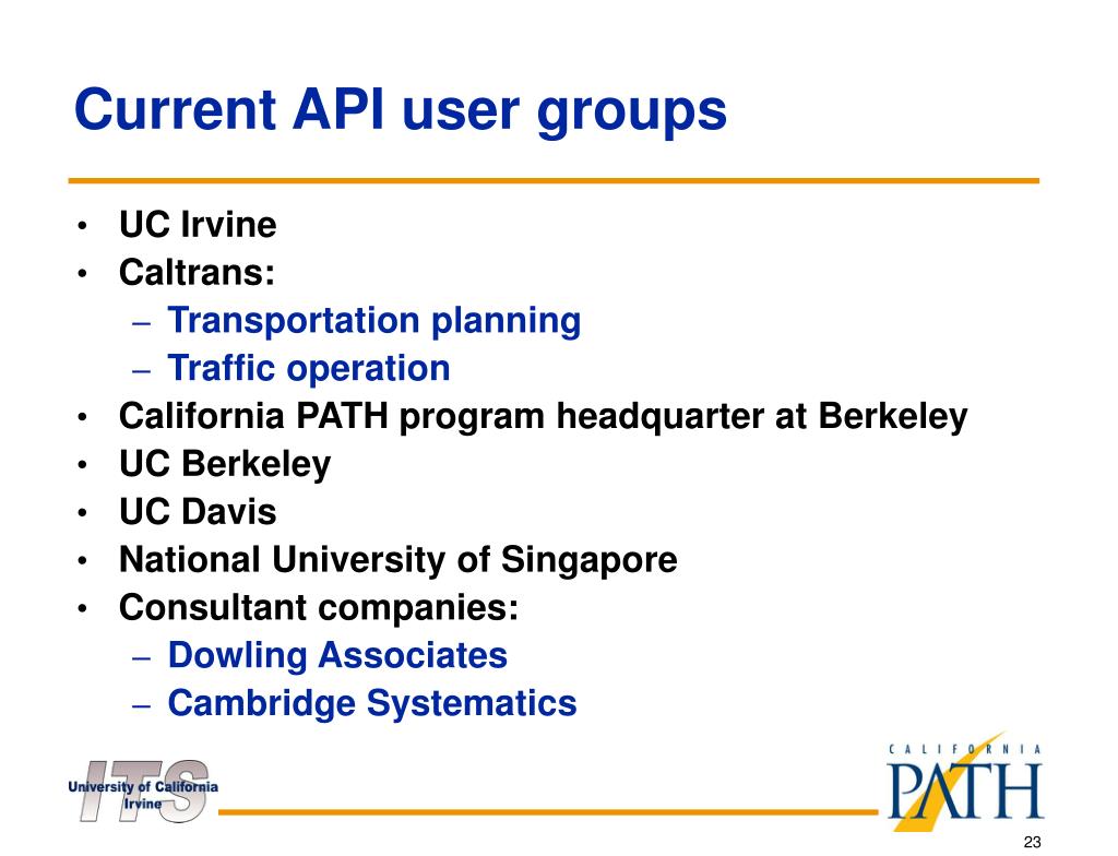 Current API user groups • UC Irvine • Caltrans: • Transportation planning • Traffic operation • California PATH program headquarter at Berkeley • UC Berkeley • UC Davis • National University of Singapore • Consultant companies: • Dowling Associates • Cambridge Systematics