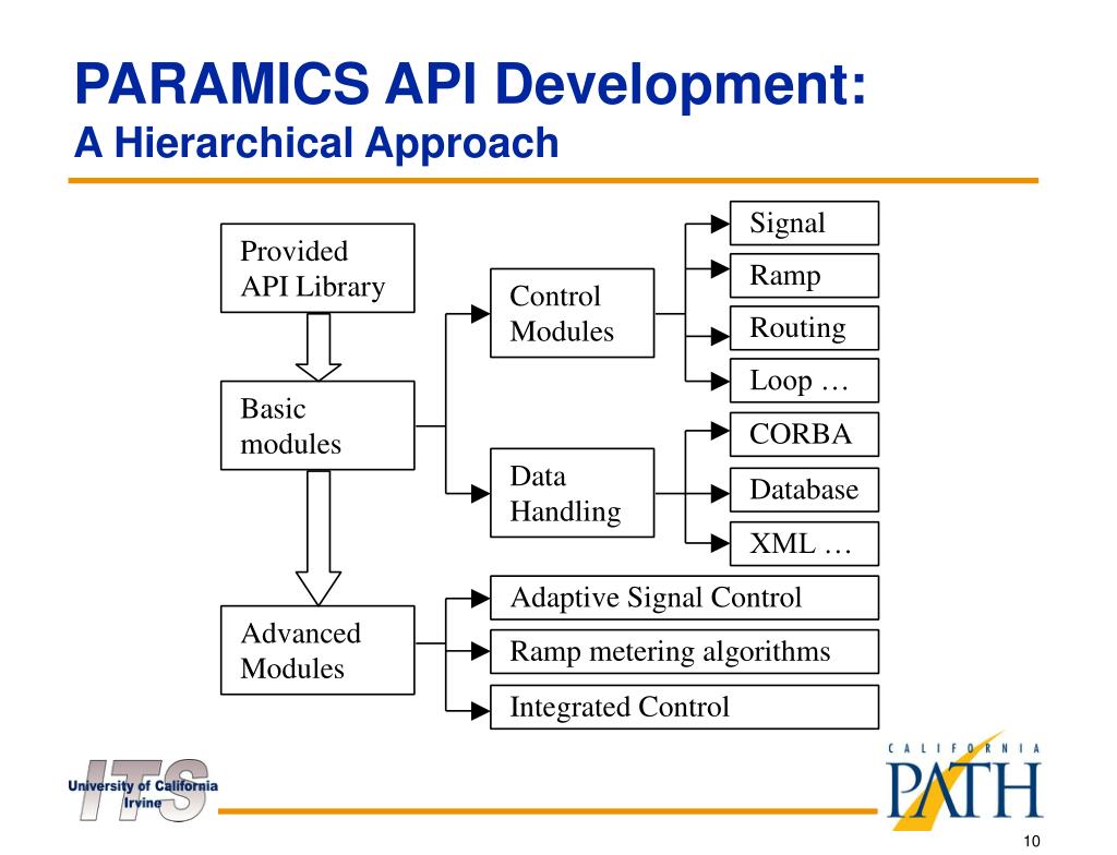 Aspects of PARAMICS need to be enhanced • Path-based Routing (a missing function) • PARAMICS: Link-based routing • Traffic controller: • Actuated signal control (a missing function) • Ramp metering control (functionality enhancement for facilitating ITS modeling) • Real-time traffic information (a missing function) • including the collection and aggregation of loop data and probe vehicle data • Database connection (functionality enhancement) • Performance measure (functionality enhancement)