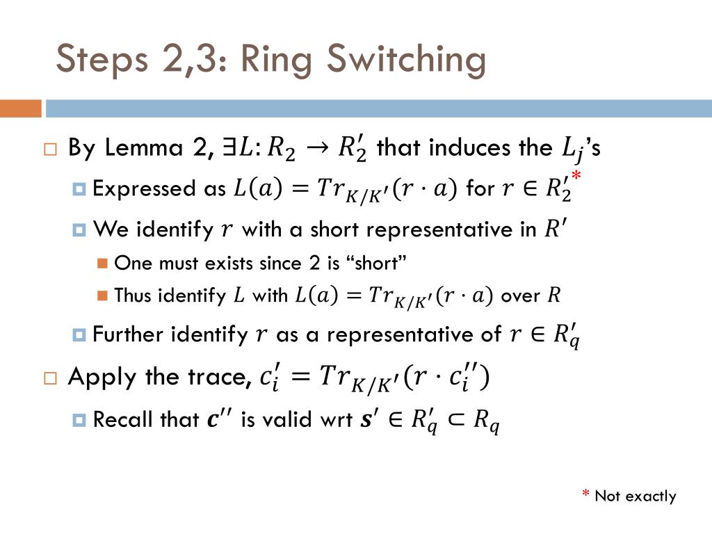 Steps 2,3: Ring Switching • By Lemma 2, that induces the ’s • Expressed as for • We identify with a short representative in • One must exists since 2 is “short” • Thus identify with over • Further identify as a representative of • Apply the trace, • Recall that is valid wrt * * Not exactly