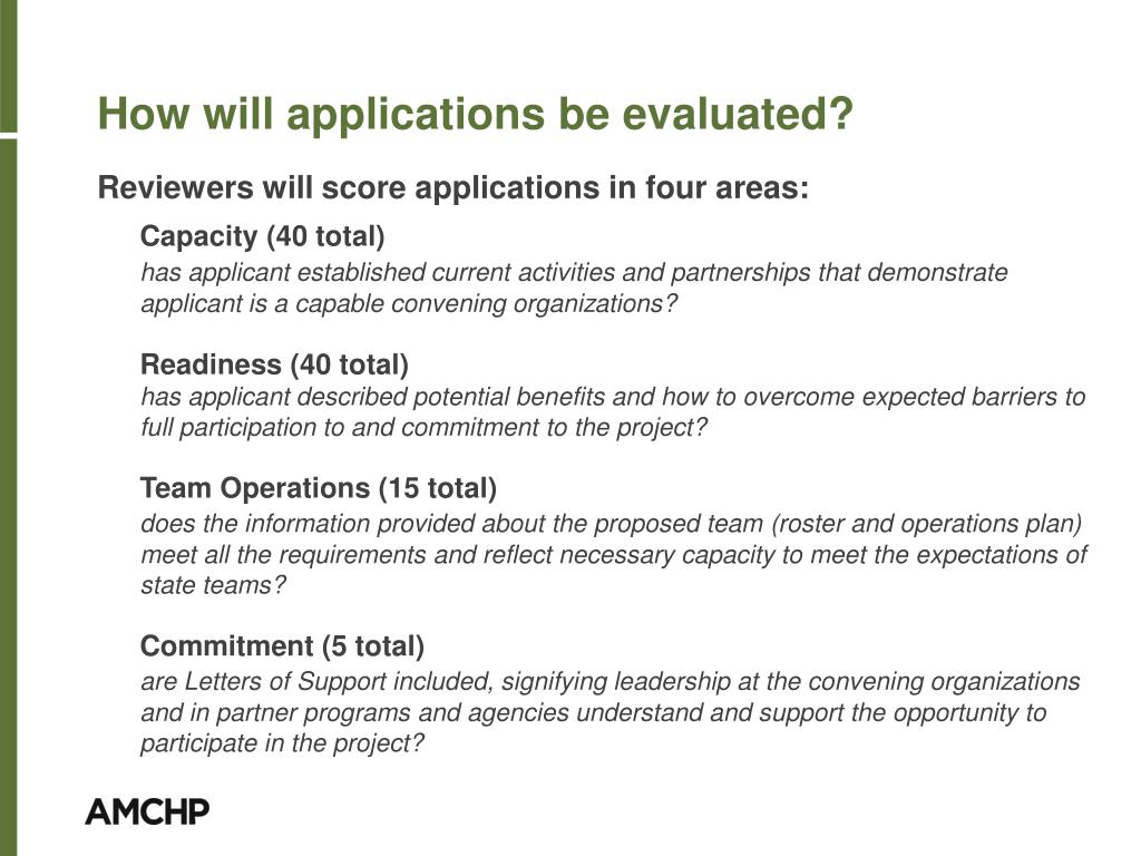 How will applications be evaluated? • Reviewers will score applications in four areas: • Capacity (40 total) • has applicant established current activities and partnerships that demonstrate applicant is a capable convening organizations? • Readiness (40 total) • has applicant described potential benefits and how to overcome expected barriers to full participation to and commitment to the project? • Team Operations (15 total) • does the information provided about the proposed team (roster and operations plan) meet all the requirements and reflect necessary capacity to meet the expectations of state teams? • Commitment (5 total) • are Letters of Support included, signifying leadership at the convening organizations and in partner programs and agencies understand and support the opportunity to participate in the project?
