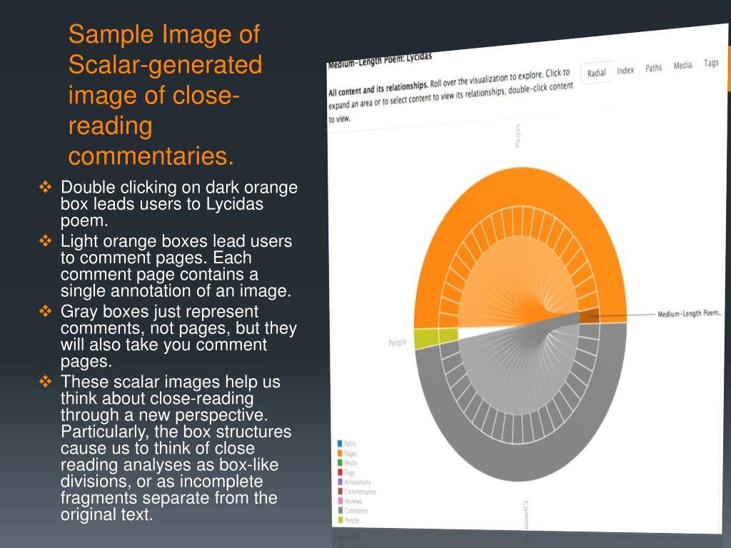 Sample Image of Scalar-generated image of close-reading commentaries. Double clicking on dark orange box leads users to Lycidas poem. Light orange boxes lead users to comment pages. Each comment page contains a single annotation of an image. Gray boxes just represent comments, not pages, but they will also take you comment pages. These scalar images help us think about close-reading through a new perspective. Particularly, the box structures cause us to think of close reading analyses as box-like divisions, or as incomplete fragments separate from the original text.