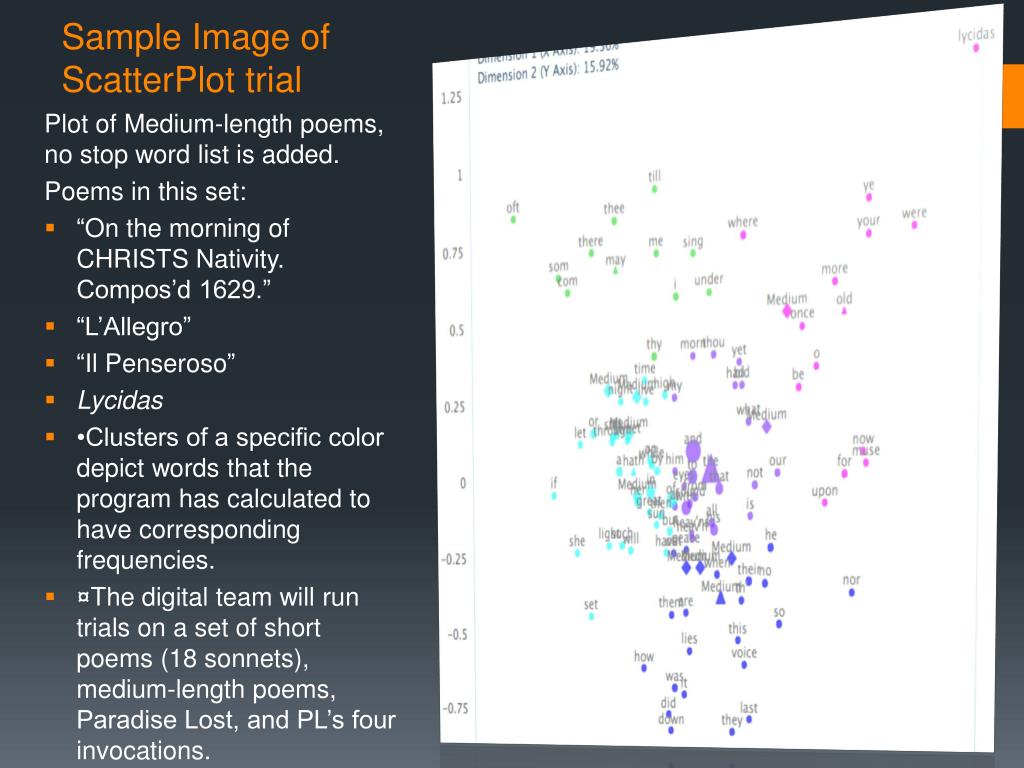 Sample Image of ScatterPlot trial Plot of Medium-length poems, no stop word list is added. Poems in this set: “On the morning of CHRISTS Nativity. Compos’d 1629.” “L’Allegro” “Il Penseroso” Lycidas •Clusters of a specific color depict words that the program has calculated to have corresponding frequencies. ¤The digital team will run trials on a set of short poems (18 sonnets), medium-length poems, Paradise Lost, and PL’s four invocations.