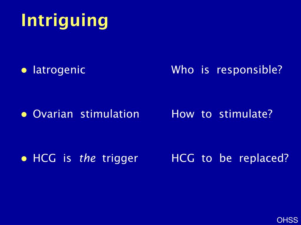 Intriguing • Iatrogenic Who is responsible? • Ovarian stimulation How to stimulate? • HCG is the trigger HCG to be replaced? OHSS