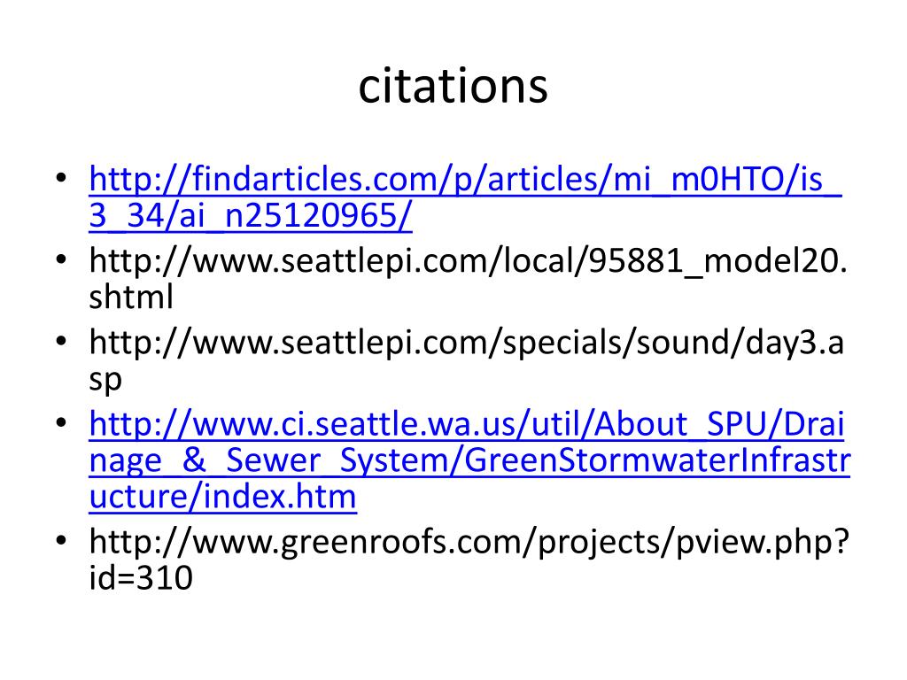 citations • http://findarticles.com/p/articles/mi_m0HTO/is_3_34/ai_n25120965/ • http://www.seattlepi.com/local/95881_model20.shtml • http://www.seattlepi.com/specials/sound/day3.asp • http://www.ci.seattle.wa.us/util/About_SPU/Drainage_&_Sewer_System/GreenStormwaterInfrastructure/index.htm • http://www.greenroofs.com/projects/pview.php?id=310