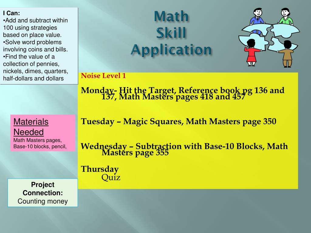 I Can: • Add and subtract within 100 using strategies based on place value. • Solve word problems involving coins and bills. • Find the value of a collection of pennies, nickels, dimes, quarters, half-dollars and dollars MathSkill Application Noise Level 1 Monday- Hit the Target, Reference book pg 136 and 137, Math Masters pages 418 and 457 Tuesday – Magic Squares, Math Masters page 350 Wednesday – Subtraction with Base-10 Blocks, Math Masters page 355 Thursday Quiz Materials Needed Math Masters pages, Base-10 blocks, pencil, Project Connection: Counting money